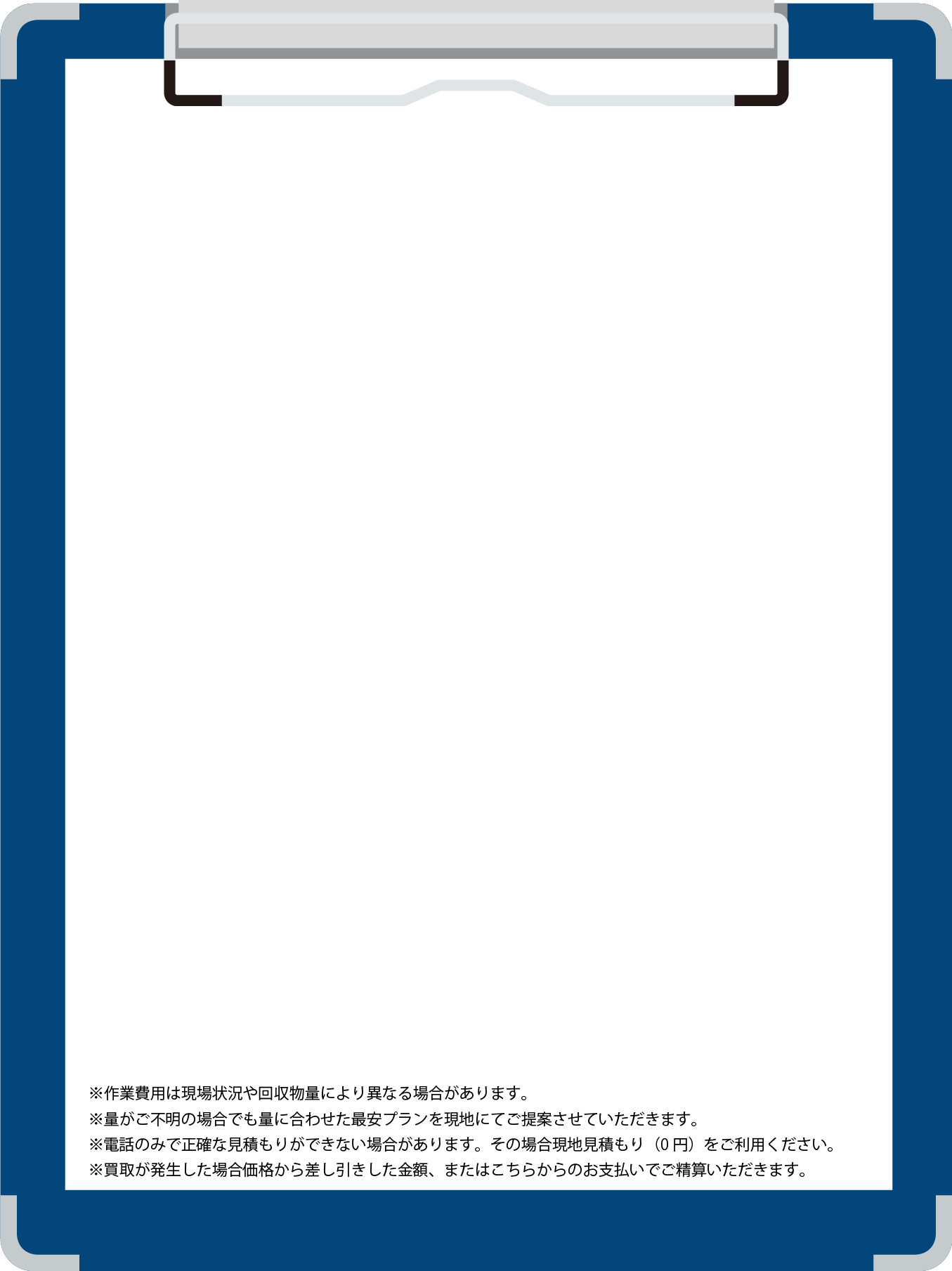 回収する物量が多いほど価格には自信がありますので他社の見積もりで疑問や不安がありましたらお気軽にお問い合わせください