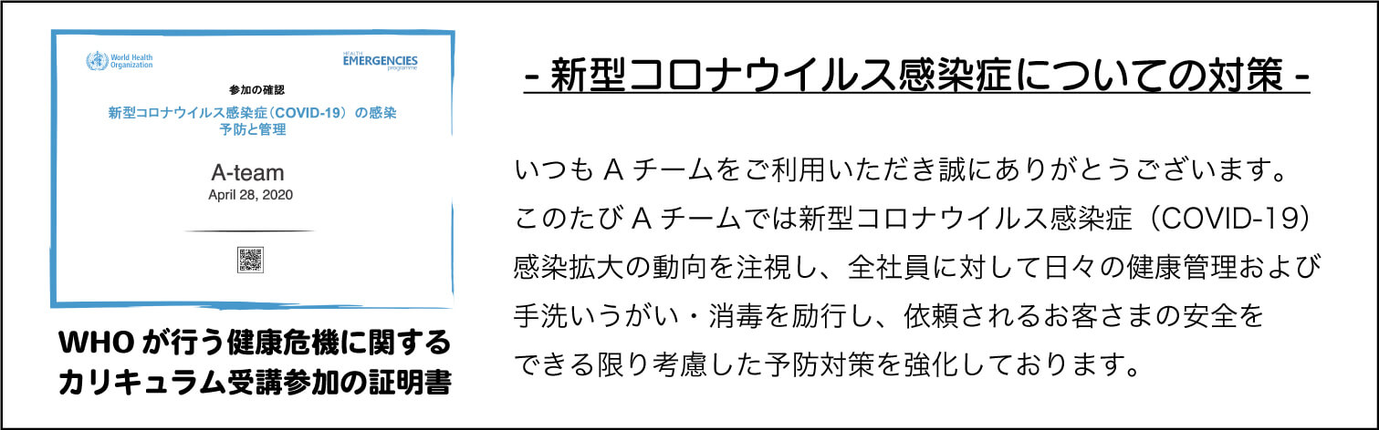 Aチームは不用品回収業者、遺品整理業者、便利屋、引越し業、買取業、など様々な業種のノウハウを有した ドリームチームです。この技術とノウハウを生かして少しでも お客様の困ったに全力で対応することをお約束します。
