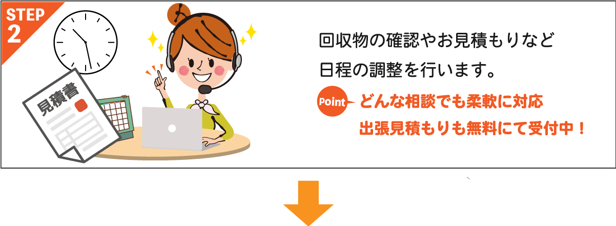 ご不要なモノは何でも片付けます。回収予定やお見積もりなど、お気軽にご相談ください。