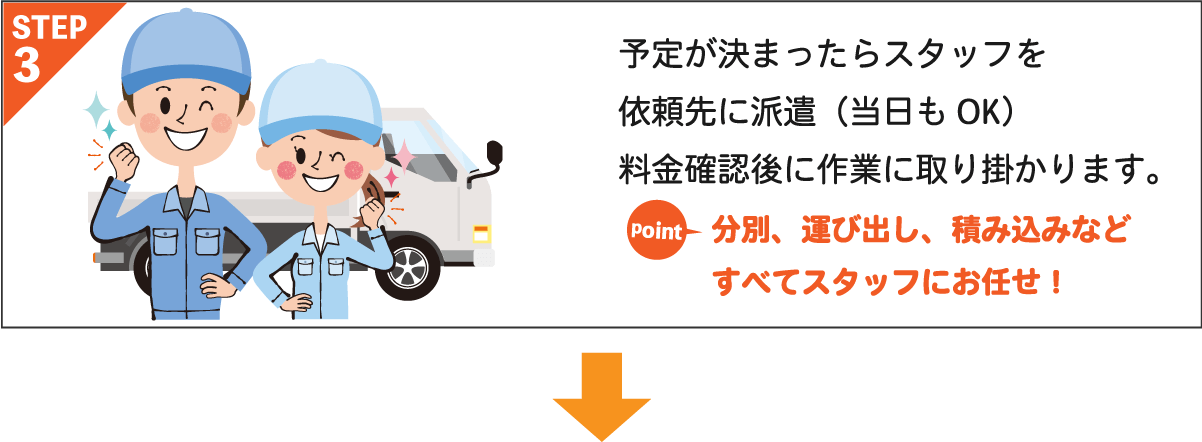 粗大ゴミや不用品の量を確認させていただき、近くで作業や待機しているスタッフを出来るかぎり早急にお客様の元へ手配いたします。